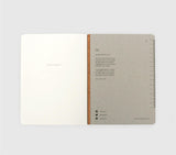 This journal has been designed to have a raw yet finished look, with an exterior composed of strong greyboard and bonded leather. It comes equipped with a leather pocket and two pen loops on the front panel, while the back panel supports screen printed details, which include a cm ruler for added function. Contains 72 sheets / 144 pages of fine-quality plain ivory paper stitched together at the spine.