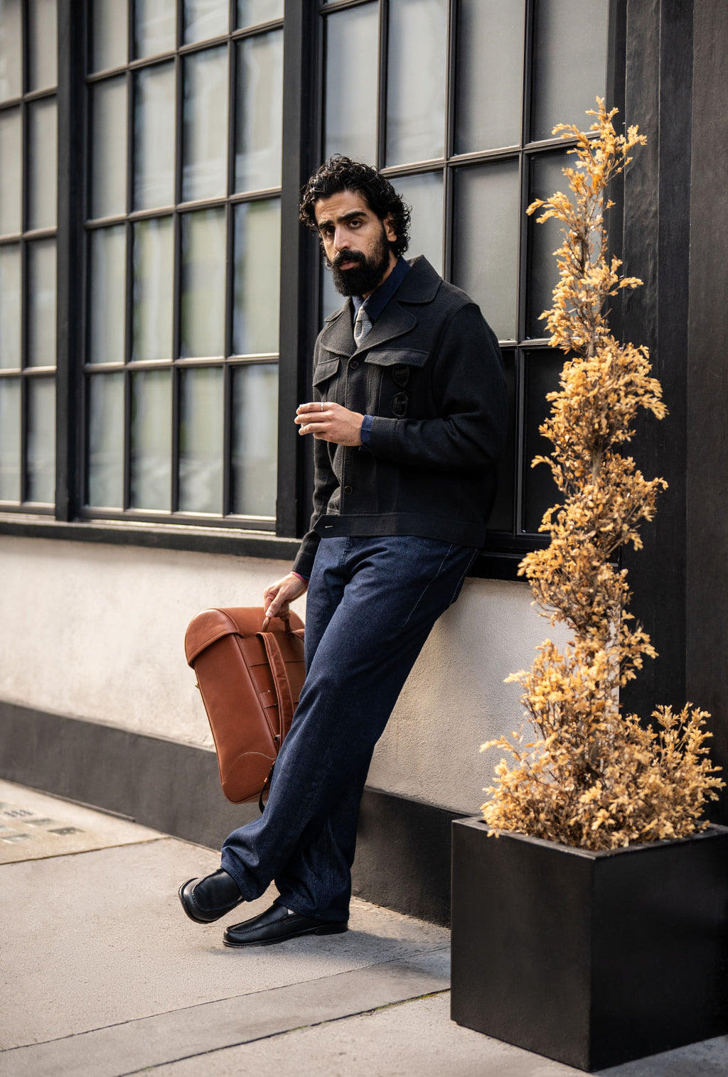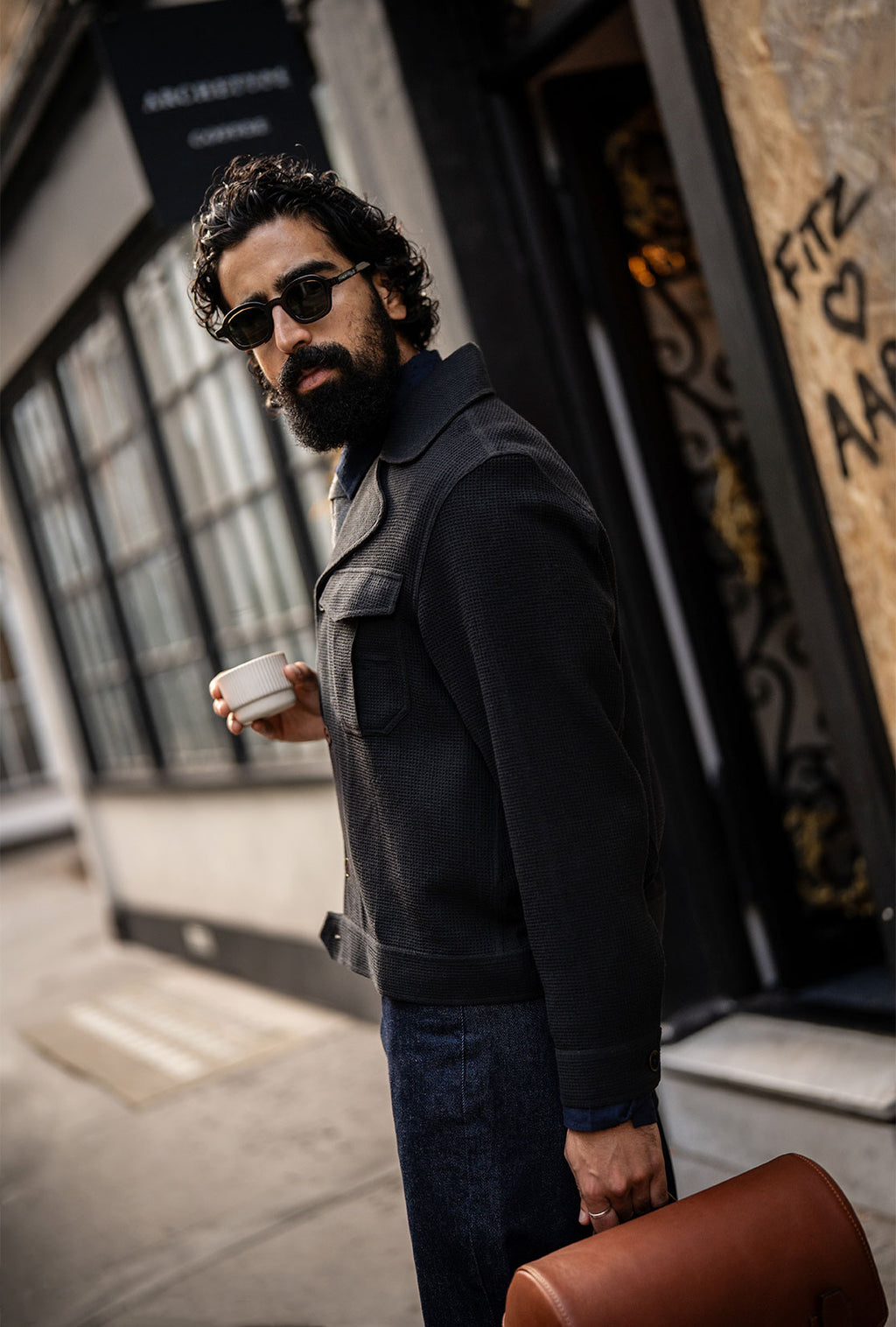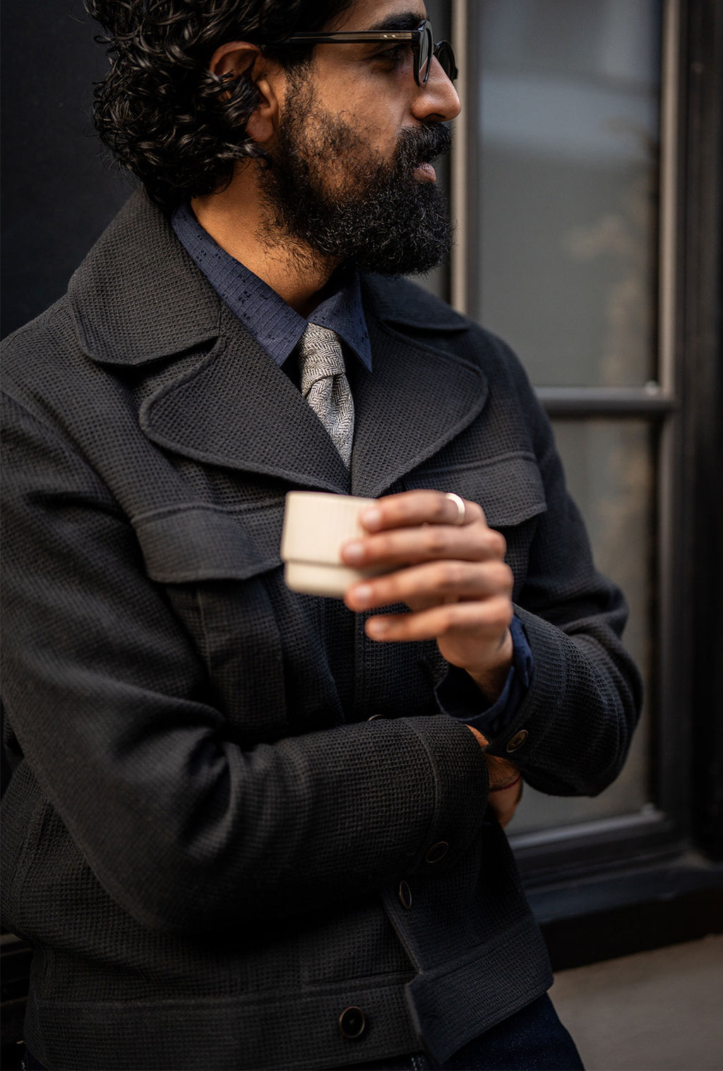 The Waffle Jacket is a classic World War II-inspired jacket built for the modern man! It's constructed from hand-dyed waffle-textured fabric without a lining for a more natural drape. It features exaggerated collars, front chest pockets with box pleats, and a four-button closure for added sophistication and functionality. The accentuated pleat design at the back, complete with the distinctive Dori envelope yoke, creates a slightly tapered look at the hem, giving a modern spin to a vintage silhouette.